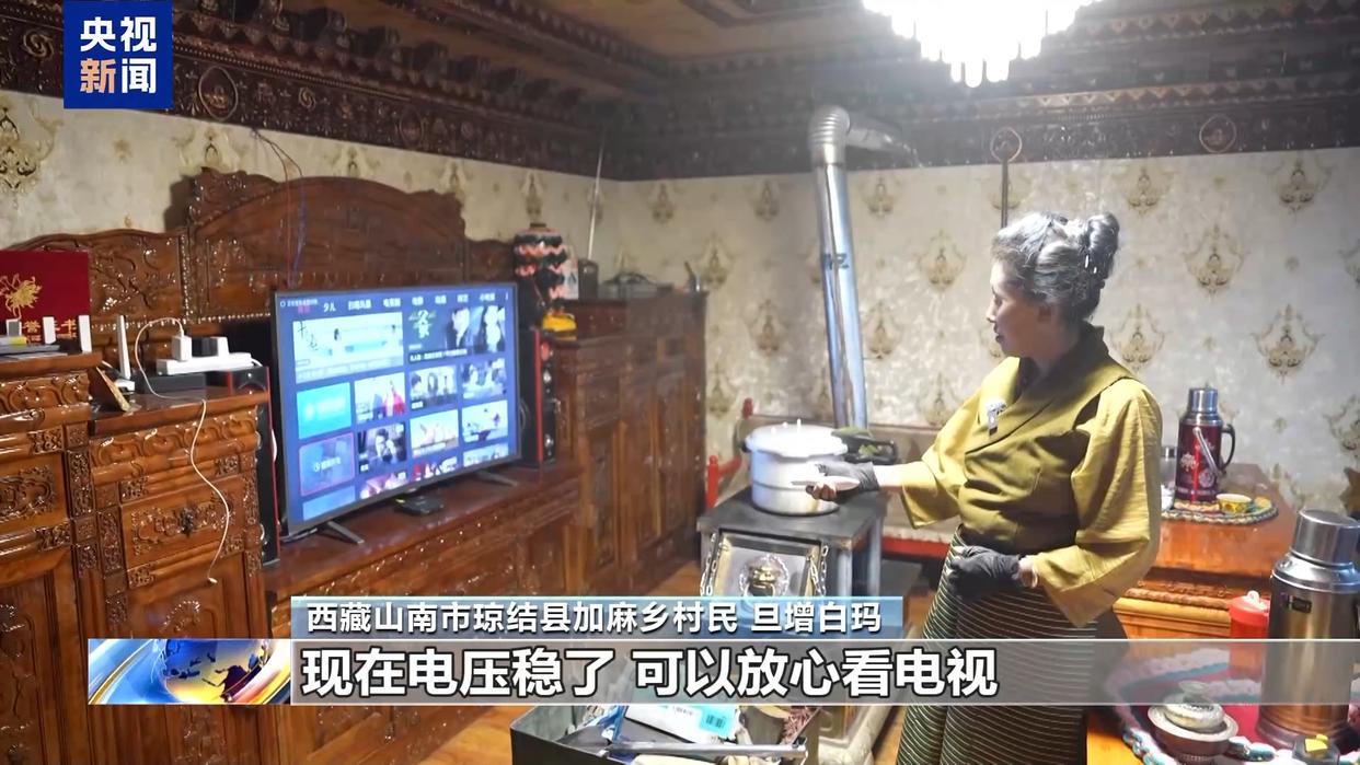 西藏山南琼结县加麻乡村民 旦增白玛:现在电压稳了,可以放心看电视。而且还买了很多新家电,冰箱、洗衣机。